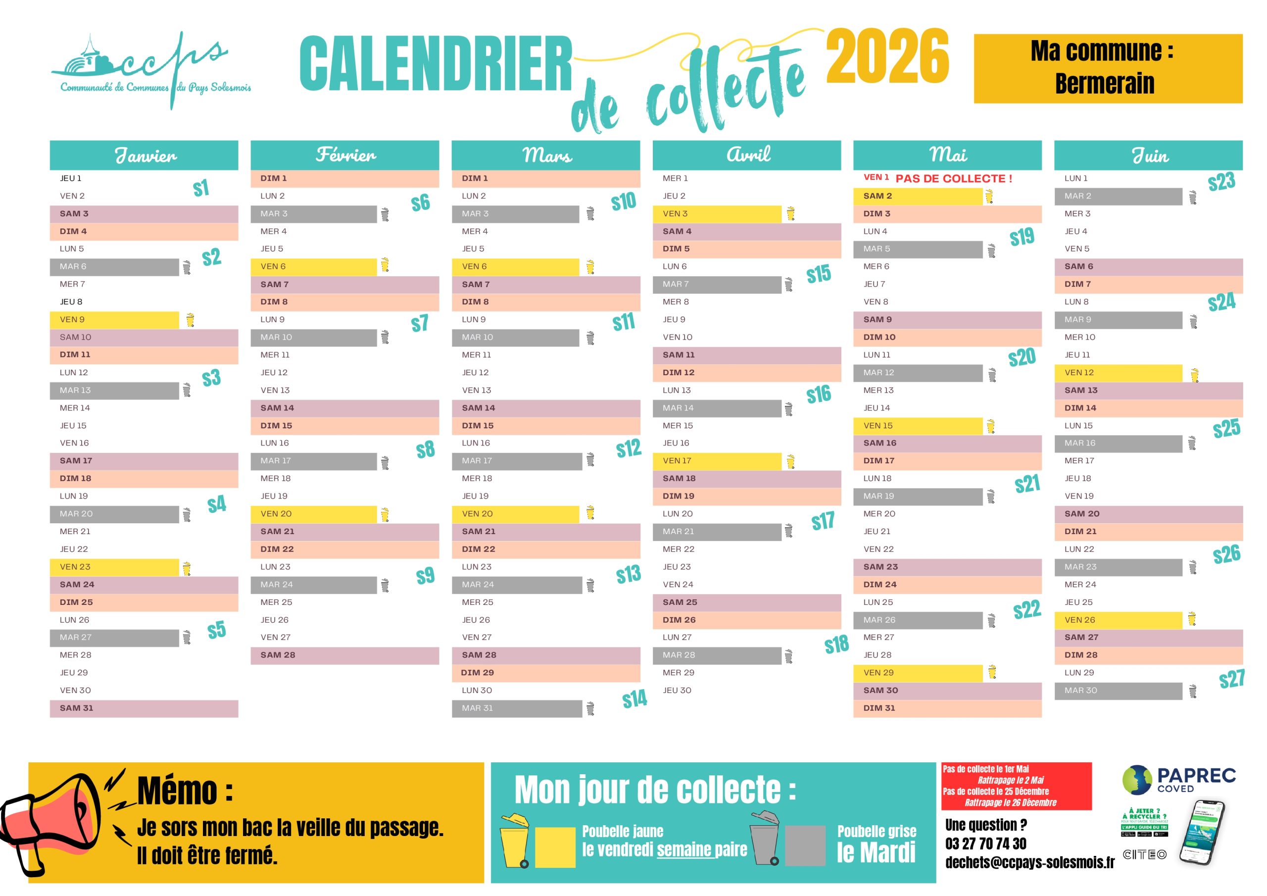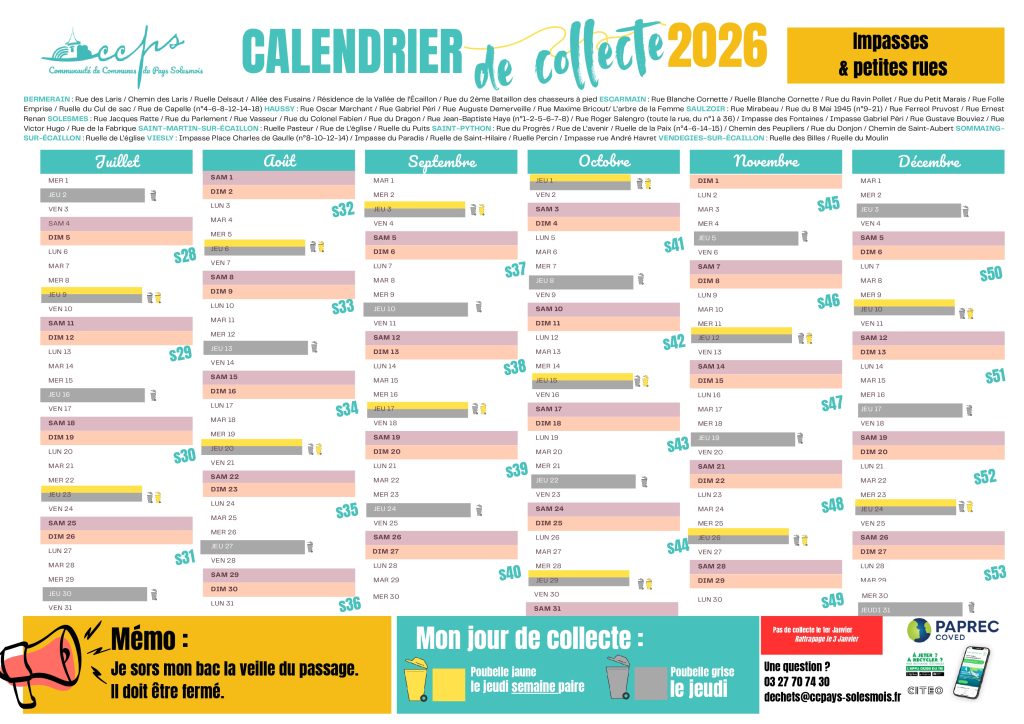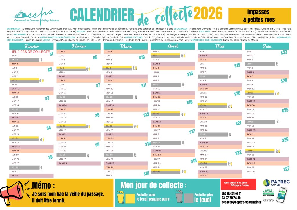 Chaque foyer (ou entité commerciale) est équipé de deux bacs : un gris et un jaune. La taille de ceux-ci est déterminée par la Communauté de Commune du Pays Solesmois, qui gère la collecte. Les nouveaux habitants sont invités à contacter la communauté de communes au 03 27 74 44 41 afin de se voir attribuer ces bacs. Leur taille sera déterminée par le nombre d’habitants du foyer, ainsi, toute évolution du nombre de personnes dans un foyer doit être signalée afin de recalculer la taille des bacs.
