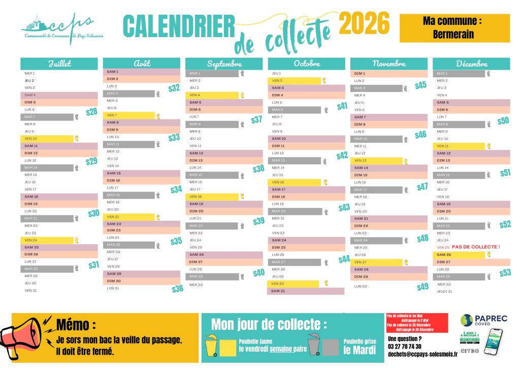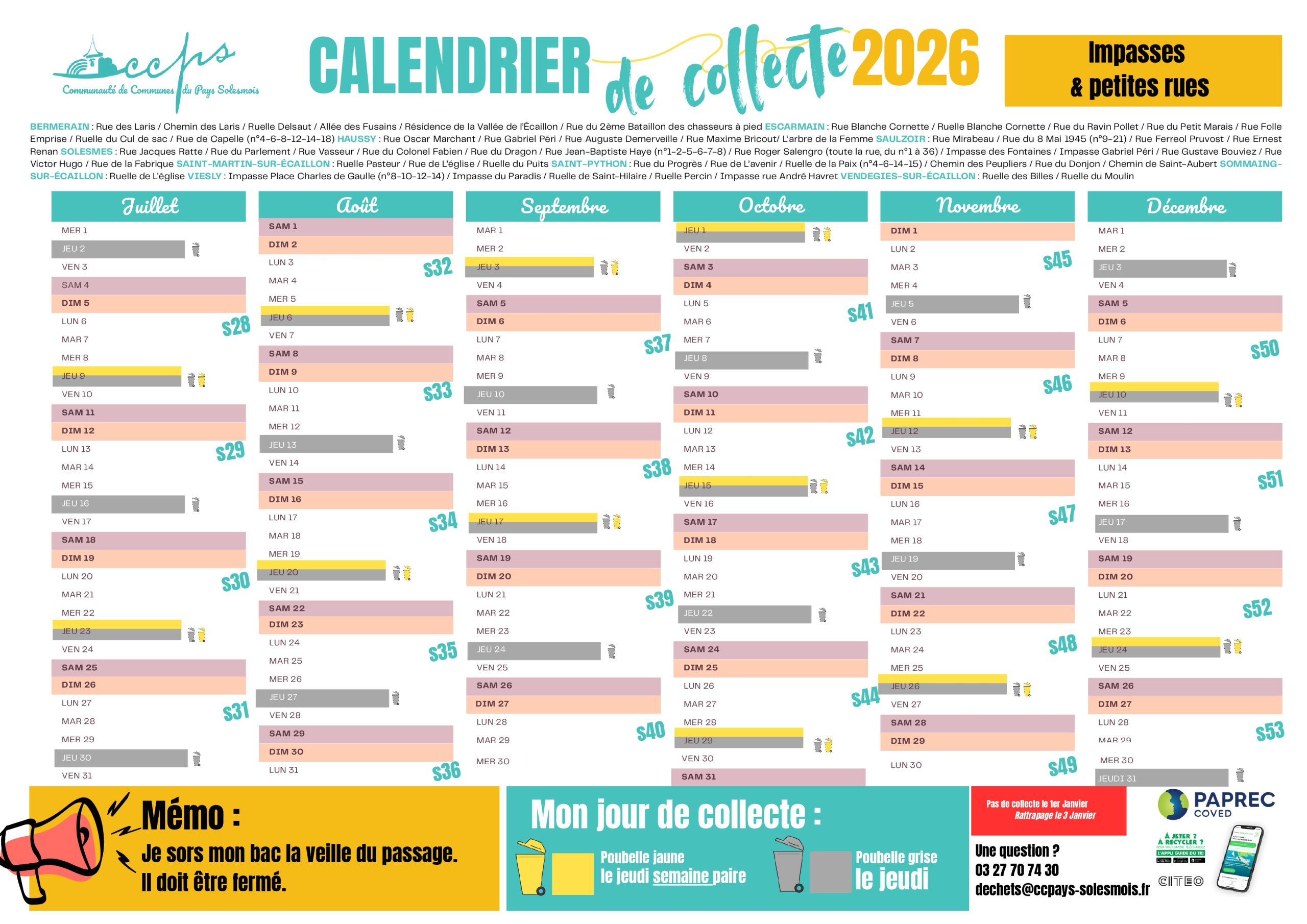 La collecte des ordures ménagères (bac gris) est assurée une fois par semaine. La collecte des recyclables (bac jaune) est assurée une fois toutes les deux semaines. Les bacs sont à sortir la veille au soir de la collecte. Les déchets doivent être présentés à la collecte exclusivement dans les conteneurs qui leur sont destinés, en fonction de leur catégorie, exempts d’éléments indésirables.